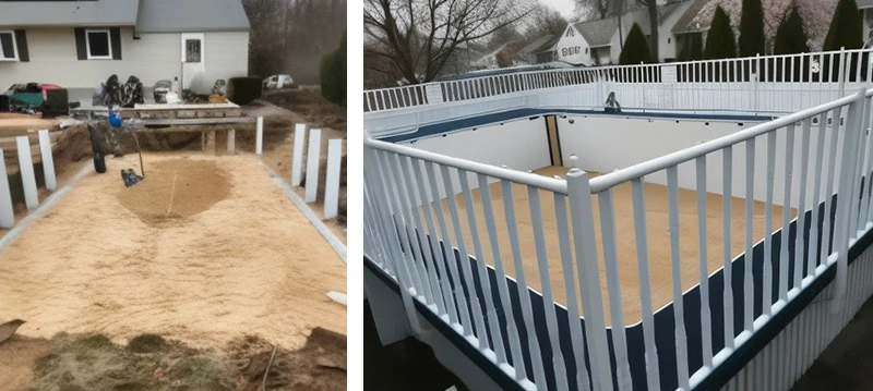 3.Bring in the sand for the pool bottom. Spread it as evenly as possible, wet it thoroughly, and compact it. Wet it again before installing the liner.